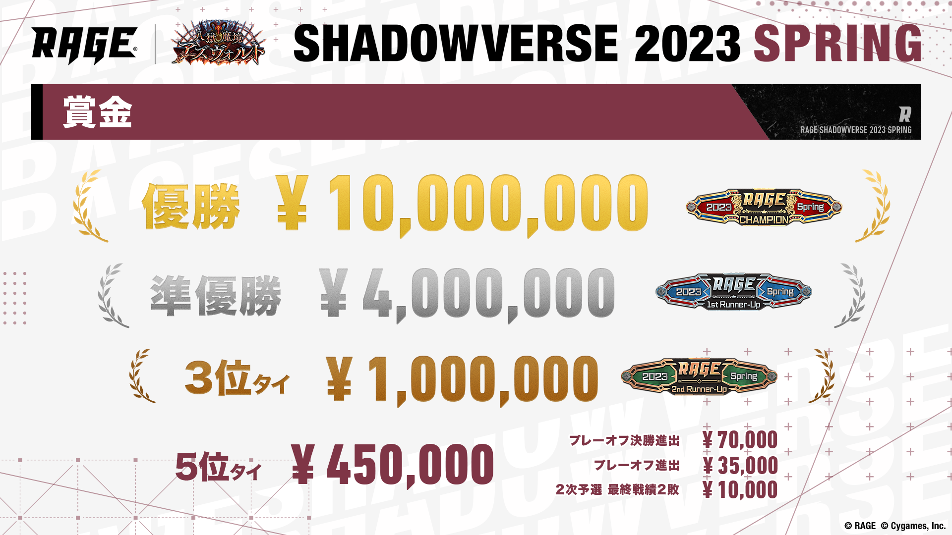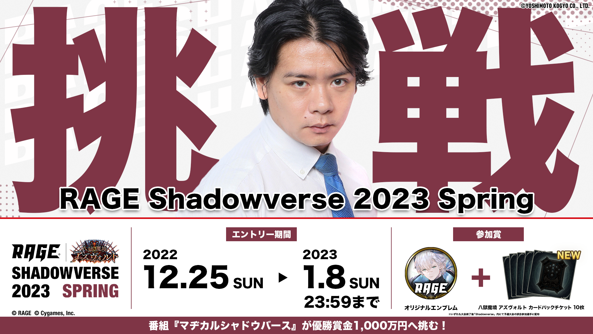株式会社CyberZ、エイベックス・エンタテインメント株式会社、株式会社テレビ朝⽇が運営する国内最⼤級のeスポーツエンターテインメント「RAGE(レイジ)」は、対戦型オンラインTCG『Shadowverse』の大会「RAGE Shadowverse 2023 Spring」を開催することを発表いたしました。開催に伴い2022年12月25日(日)から2022年1月8日(日)までエントリーを受け付けます。