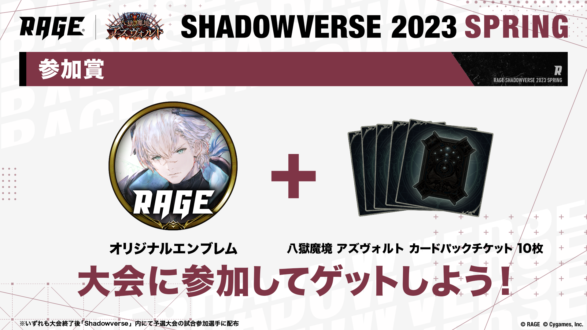 さらに参加賞として全員に「RAGEオリジナルエンブレム」と、「八獄魔境アズヴォルトカードパックチケット10枚」が贈られます。