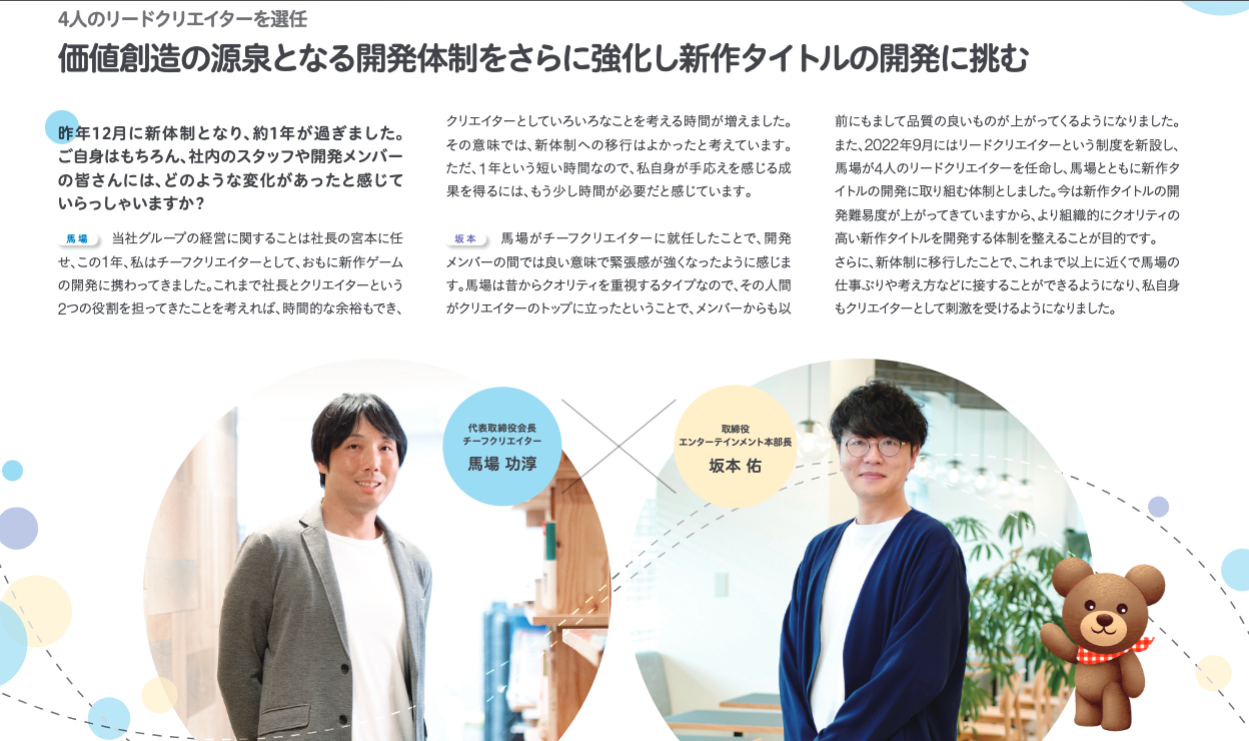 チーフクリエイターとして新規事業と新作ゲームの開発に注力する馬場が、エンターテインメント事業を管掌する坂本との対談を通じて、新しいゲーム開発体制やブロックチェーンやNFTなど次世代技術を活用した新規事業、今後の展望について語っています。
