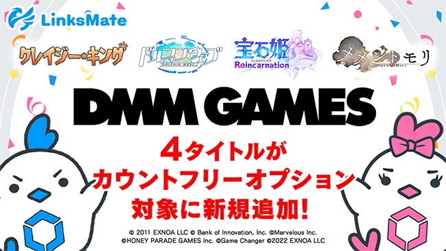 株式会社LogicLinks(以下LogicLinks、本社:東京都渋谷区、代表取締役社長:春田康一)は、MVNOサービス「LinksMate」において2022年12月26日(月)よりカウントフリーオプション対象コンテンツとして合同会社EXNOA(本社:東京都港区、CEO:村中 悠介)が提供するオンラインゲームプラットフォーム『DMM GAMES』にて配信中の「メメントモリ」「ドルフィンウェーブ」「クレイジー・キング」「宝石姫 Reincarnation」を新たに追加することをお知らせいたします。