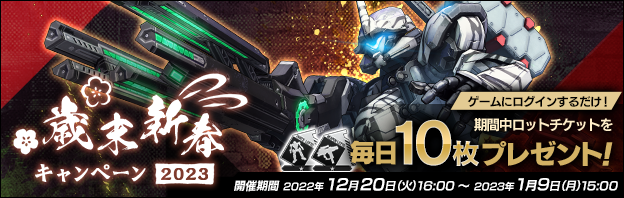 キャンペーン期間中にゲームにログインした方全員にゲーム内通貨「コアシード」2000がもらえるほか、武器や機体の獲得に使える「ロットチケット」が毎日10枚もらえるプレゼントキャンペーンを開催中です。さらに1月1日(日)からはお年玉プレゼントも…?!