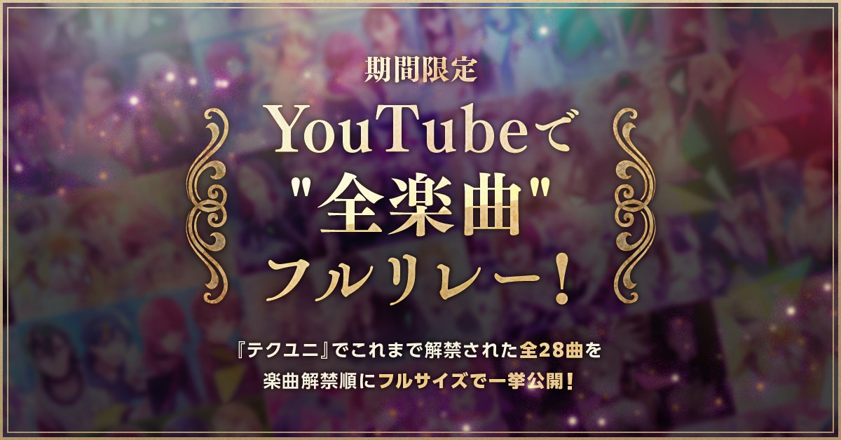 初回アニメ放送終了後、深夜0:30〜、スマホゲーム『テクノロイド ユニゾンハート』1周年を記念して、これまでYouTubeではShort ver.のみ公開していた楽曲全28曲を、楽曲解禁順にフルサイズで一挙公開!
