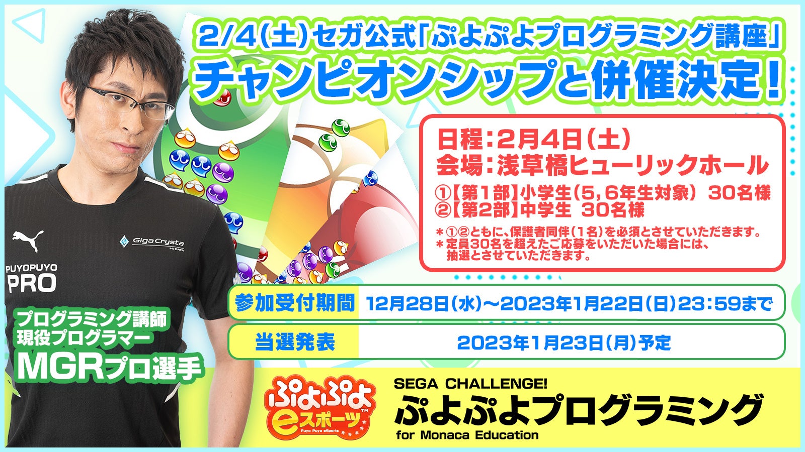 株式会社セガ(本社:東京都品川区、代表取締役社長COO:杉野行雄、以下セガ)は、セガ公式のイベントとして「ぷよぷよプログラミング講座」を2023年2月4日(土)に、浅草橋ヒューリックホールにて開催することを決定いたしました。当日は、同会場にてセガ公式プロ大会「ぷよぷよチャンピオンシップSEASON5 STAGE4 決勝トーナメント」やぷよぷよのプロ選手との対戦会も併催予定です。「プログラミング講座」「セガ公式プロ大会」「プロ選手との対戦会」はすべて入場無料です。ぜひ「ぷよぷよプログラミング講座」での勉強やプロ選手たちによる「セガ公式大会」観覧などを通して「ぷよぷよ」をお楽しみください。