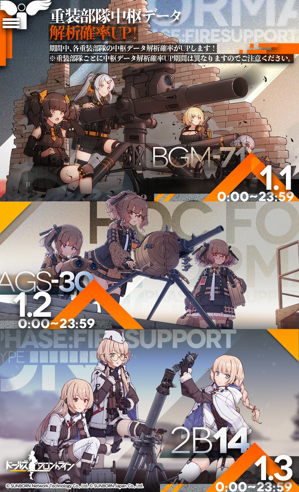 1月1日(日)0時より、【情報解析】を行った際に各重装部隊の中枢データ解析確率がUPします。