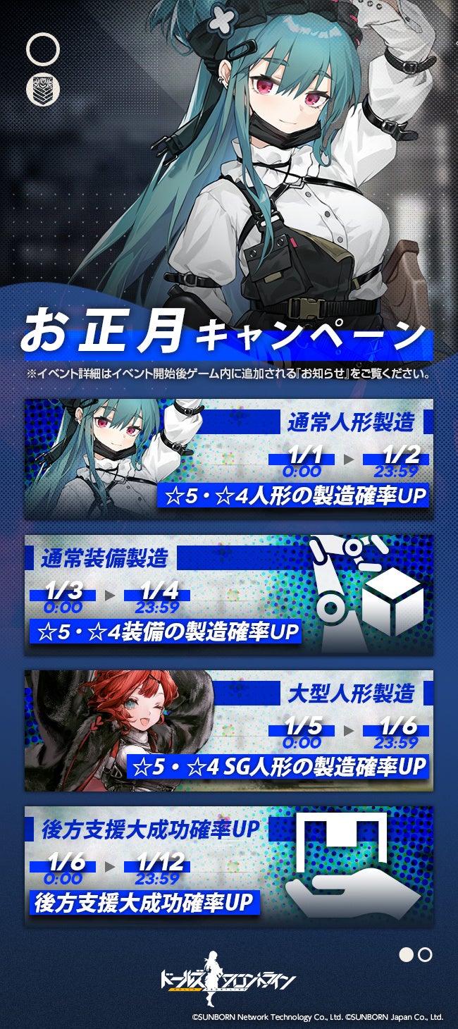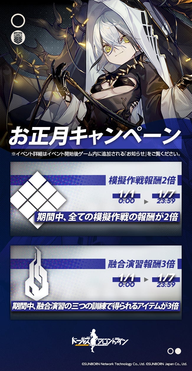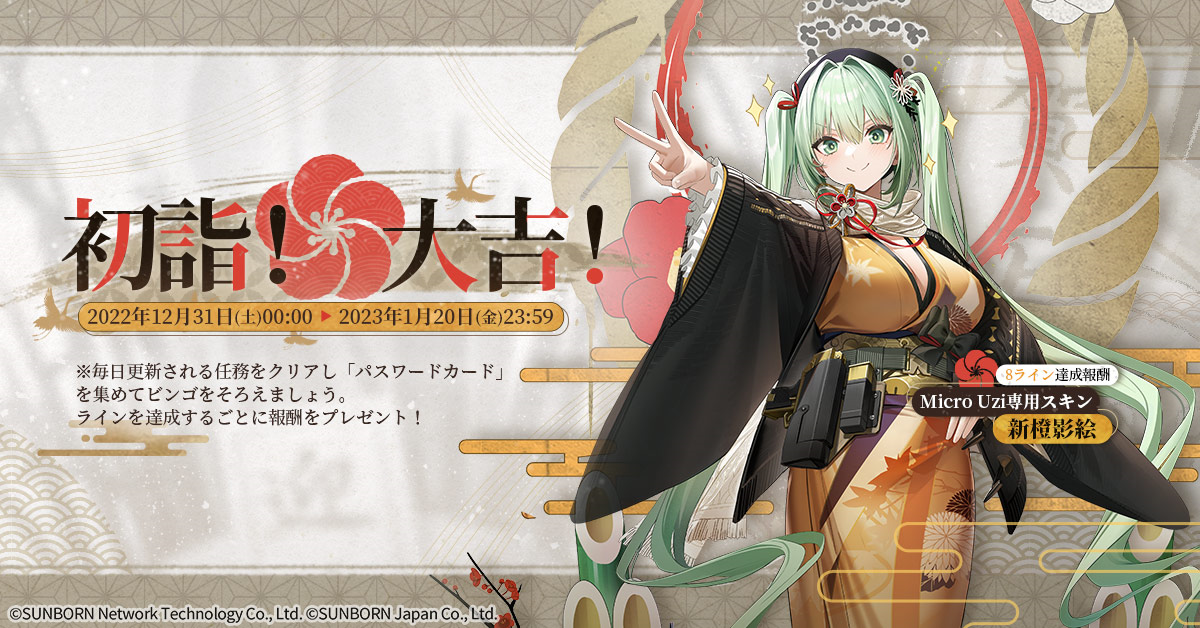 株式会社サンボーンジャパンは、スマホ向け戦略型シミュレーションゲーム『ドールズフロントライン(以下、「ドルフロ」)』が、2023年1月1日(日)より煌びやかな着物スキンが追加されることをお知らせいたします。