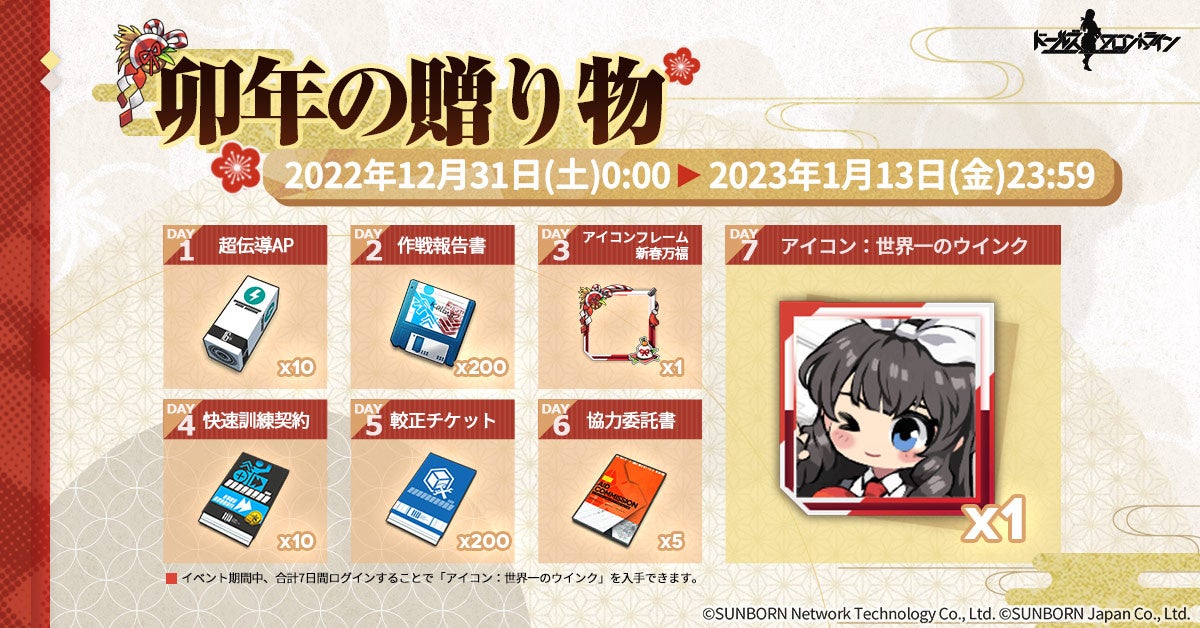 累計7日間ログインすることで64式自限定アイコン「世界一のウインク」や各種アイテム等が貰えるログインイベント「卯年の贈り物」を開催します。是非、ログインしてアイテムをお受け取りください。