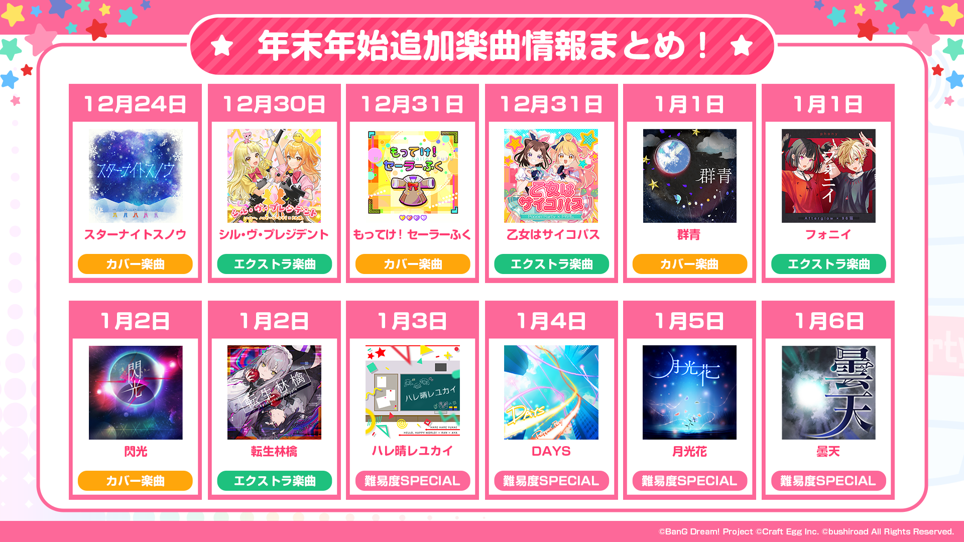 スマートフォンアプリの企画開発事業を展開する株式会社Craft Egg(本社:東京都渋谷区 代表取締役:森川 修一、以下、Craft Egg)と、株式会社ブシロード(本社:東京都中野区 代表取締役社長:木谷 高明、以下、ブシロード)の共同制作によるスマートフォン向けゲーム「バンドリ! ガールズバンドパーティ!」(以下、ガルパ)は、2022年12月31日(土)15時より、「ドリームフェスティバルガチャ」を開催いたしました。また、3日間連続で毎日1曲ずつカバー楽曲を追加するキャンペーンや、2023年1月1日(日)より、1日10回無料ガチャなどの様々なキャンペーンを開催いたします。