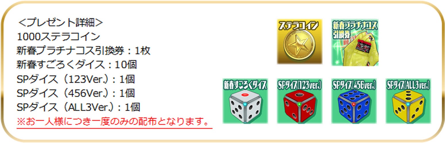 期間中にログインすると、ゲーム内通貨『1000ステラコイン』や、お気に入りの女の子の《振袖2023》SRメモカが入手できる『新春プラチナコス引換券』1枚を含む、豪華アイテムを全プレイヤーにプレゼント!