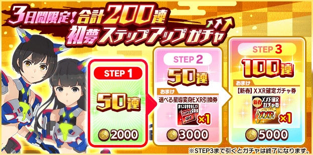 STEP2では『選べる星導変身EXRメモカ引換券』、STEP3で『【新春】XXR確定ガチャ券』が付いてくる合計200連のスペシャルなステップアップガチャが登場!