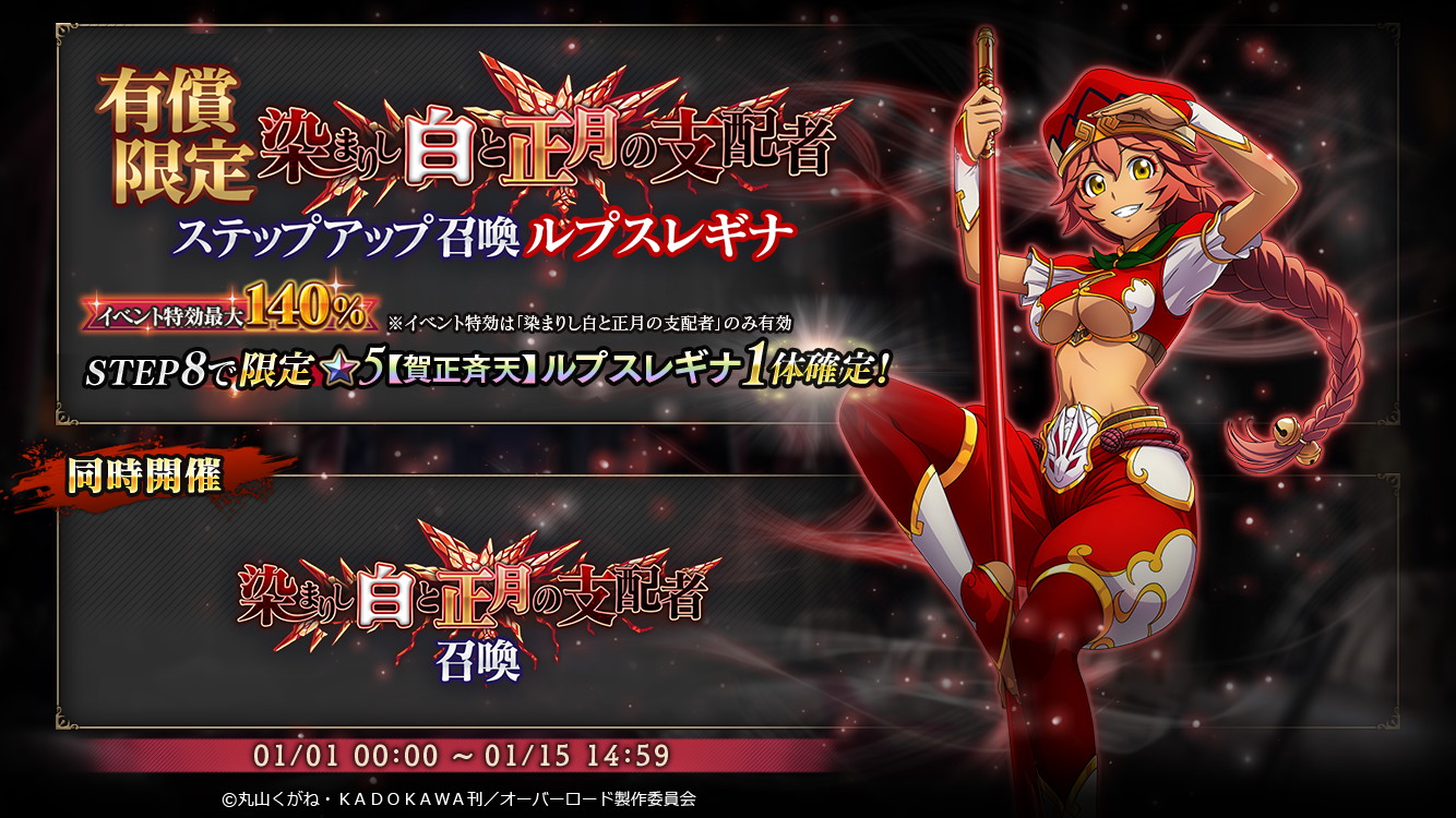 1/1よりイベント『染まりし白と正月の支配者』を開催いたします!イベント連動召喚では『★5【佳麗賀正】ナーベラル』『★5【賀正斉天】ルプスレギナ』が新登場!その他、新召喚『有償限定混沌適応ステップアップ召喚』を実施!新登場『★5【混沌適応:賀正衣】モモンガ』が獲得できるチャンス!