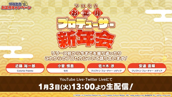 1月3日(火)13時より、「プロセカお正月プロデューサー新年会」を配信いたします。近藤裕一郎(Colorful Palette)、小菅慎吾(セガ)、佐々木渉(クリプトン・フューチャー・メディア)、安達直輝(クリプトン・フューチャー・メディア)が出演し、リリース前から今までを振り返ったり、これからについての夢を語る番組です。