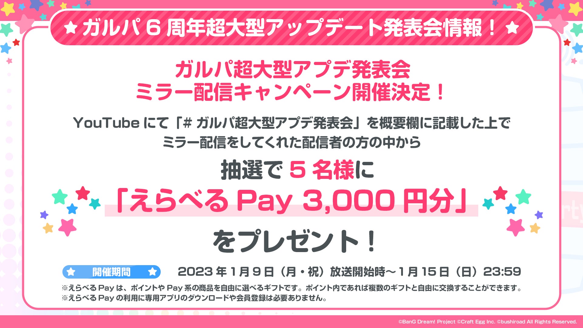 YouTubeにて「#ガルパ超大型アプデ発表会」を概要欄に記載しミラー配信をしてくれた方の中から、抽選で5名様に「えらべるPay3000円分」をプレゼントする「ガルパ超大型アプデ発表会ミラー配信キャンペーン!」を実施いたします。