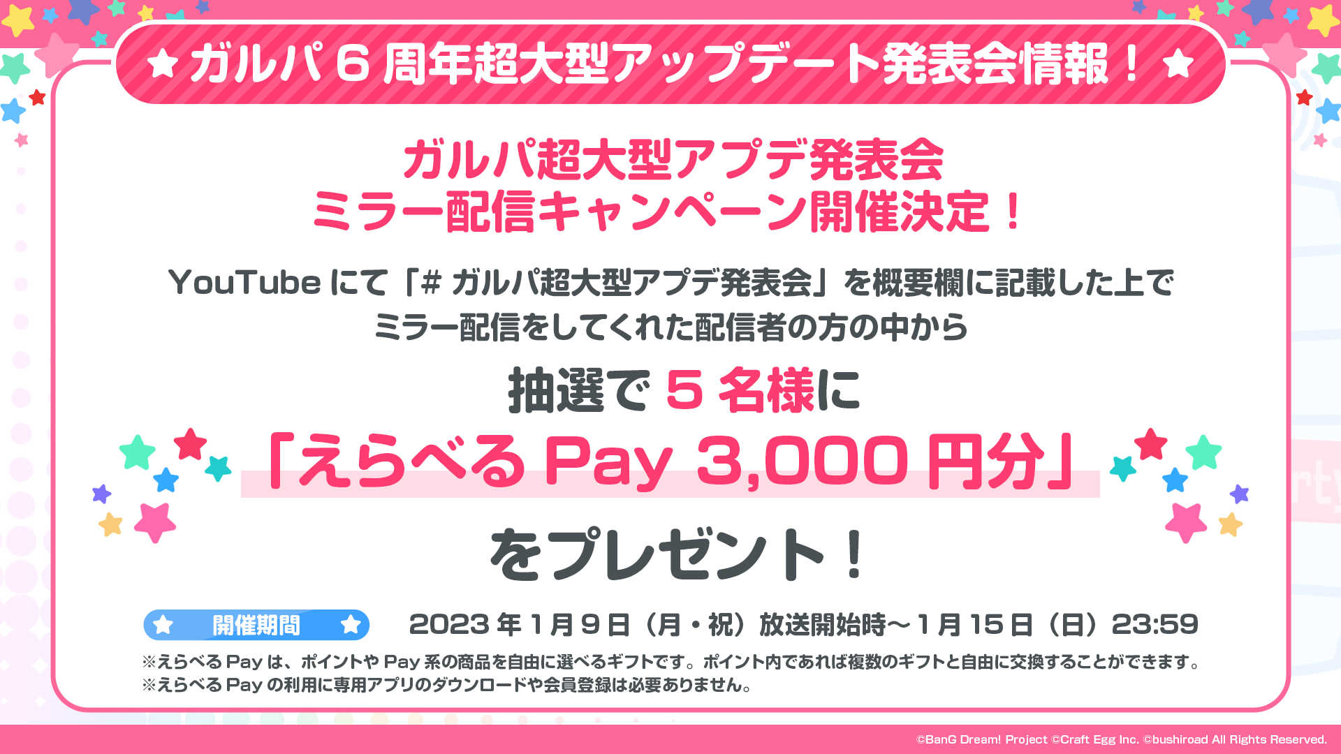 YouTubeにて「#ガルパ超大型アプデ発表会」を概要欄に記載しミラー配信をしてくれた方の中から、抽選で5名様に「えらべるPay3000円分」をプレゼントする「ガルパ超大型アプデ発表会ミラー配信キャンペーン!」を実施いたします。