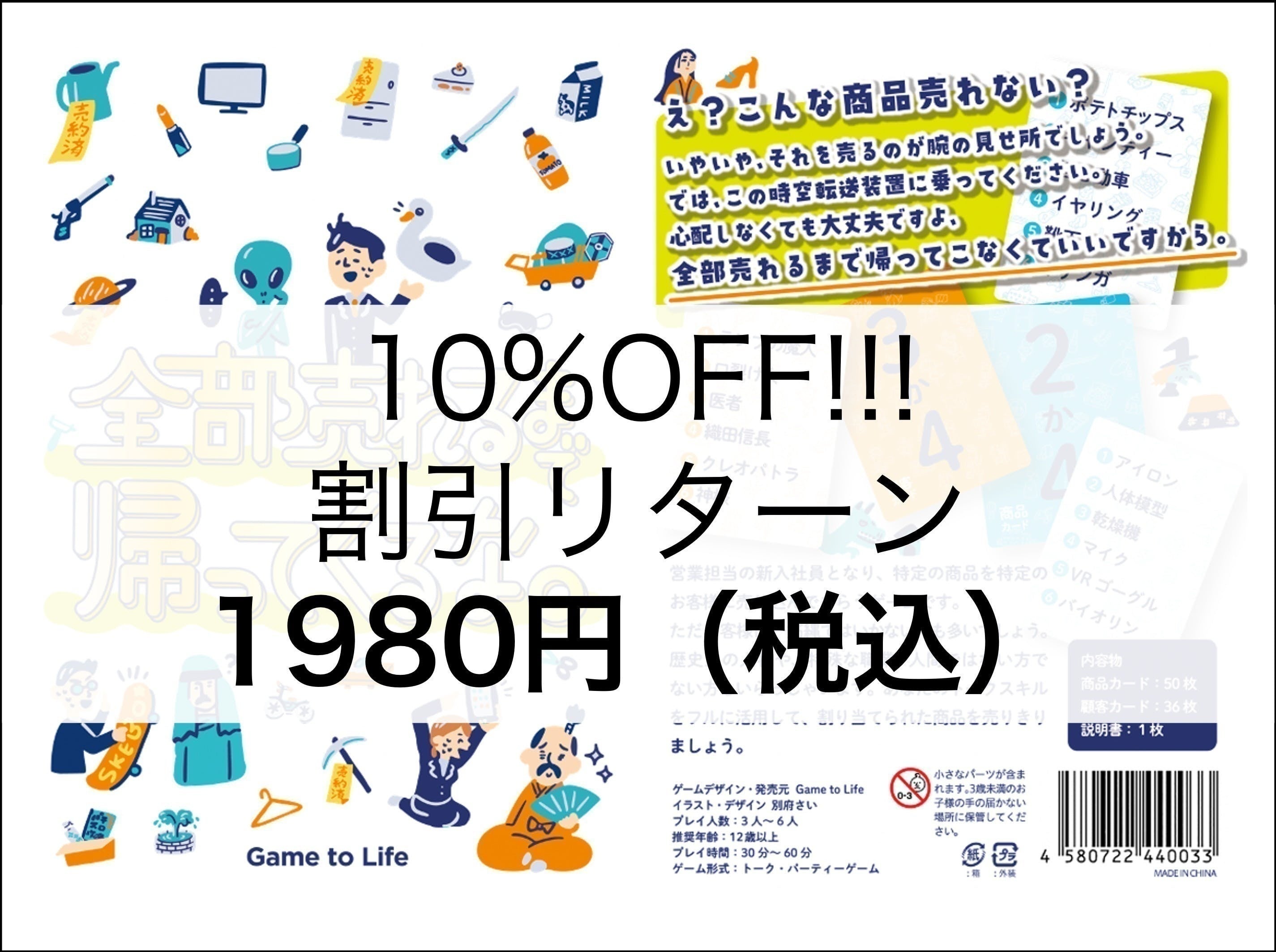 ボードゲーム「全部売れるまで帰ってくるな。」は、時空商事の営業社員となって割り当てられた商品をお客様に販売することを目指すトークゲームです。しかし、売り込むお客様は特殊な方々ばかり。