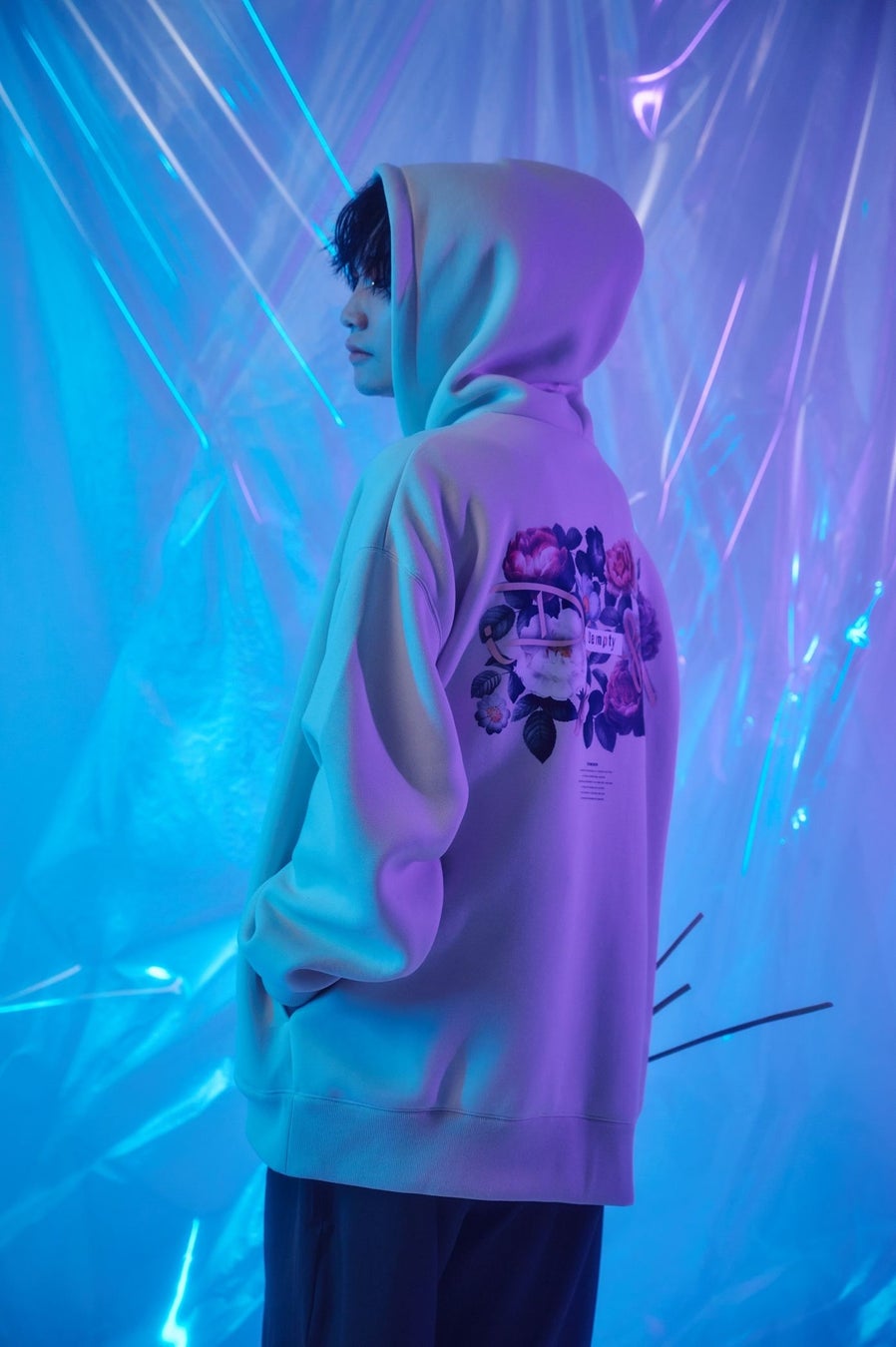 シルエットとバックプリントが特徴的なフーディーです。羽織りものとして使うときに前身頃のシルエットが崩れないようドットボタンを採用。背中には作中のバベルに集うアンドロイド20体の誕生花をイメージした花が描かれています。素材はリサイクルポリエステル糸を100%使用したダンボールニット素材。ふくらみが有り、やわらかでスポンディッシュな風合いが特徴です。秋から春にかけて、肌寒いときにきちんと防寒もできて、それでいて軽いブルゾンとしてもご利用いただけます。色も明るめのベージュで、カジュアルでありながら様々な機会に対応できる一枚です。