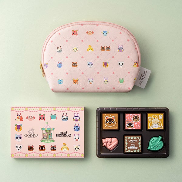 ゲームに登場するキャラクターなどをデザインした限定チョコレートのアソートメント「ゴディバ meets あつまれ どうぶつの森 アソートメント」やコラボレーションオリジナルデザインのポーチが付いた「ゴディバ meets あつまれ どうぶつの森 アソートメント オリジナルポーチつき」、コラボレーション限定フレーバーのG ショコラの詰め合わせ、バレンタインデー催事場限定商品など、全6種類が登場します。