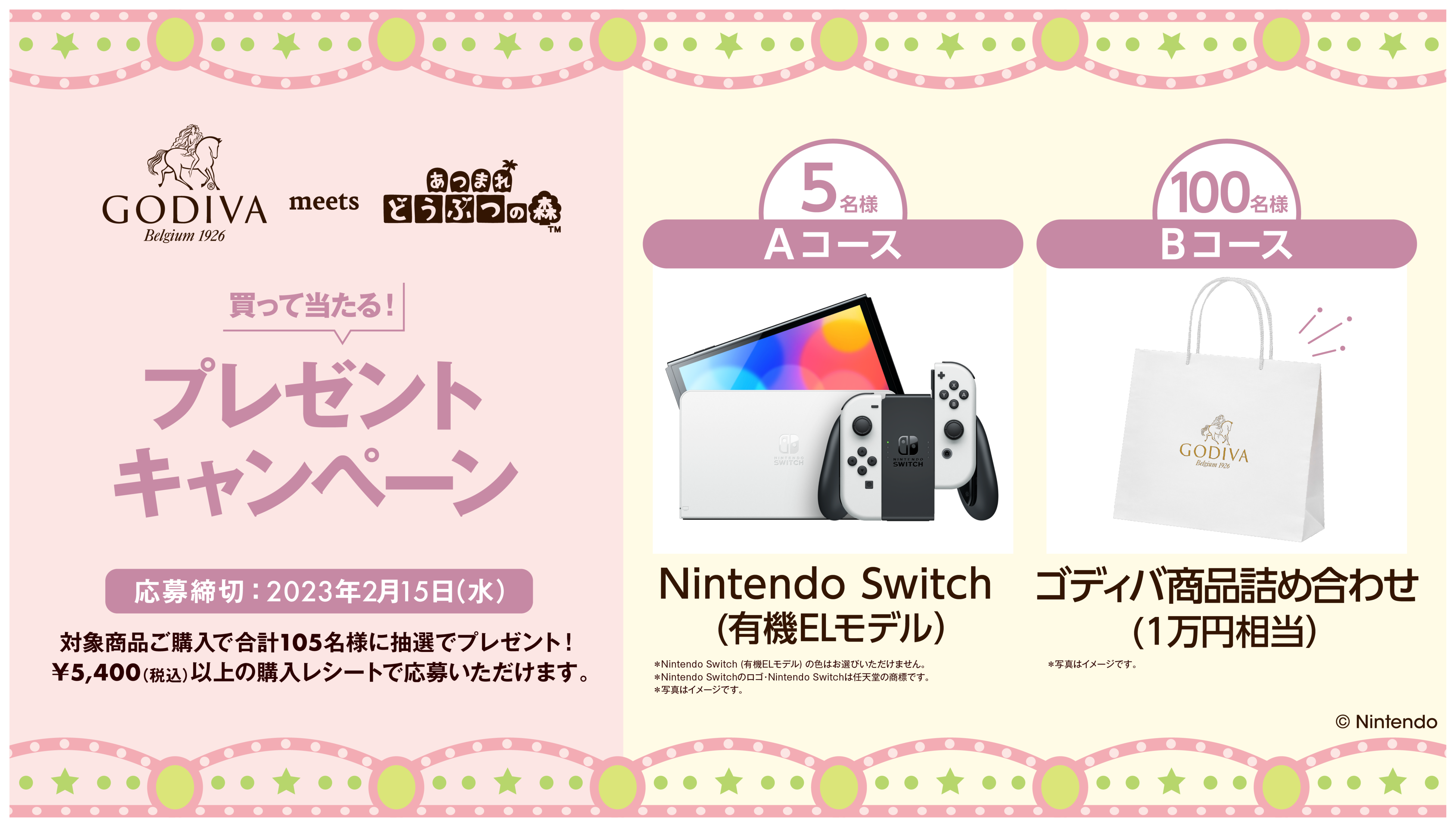 ゴディバ ジャパン株式会社(東京都港区)は、本日より販売の、2023年のバレンタイン限定「ゴディバ meets あつまれ どうぶつの森」コレクションの発売を記念して、Nintendo Switch(有機ELモデル)などの豪華な賞品が当たる「買って当たる!プレゼントキャンペーン」、および、「壁紙プレゼントキャンペーン」を、2023年1月6日(金)より実施します。