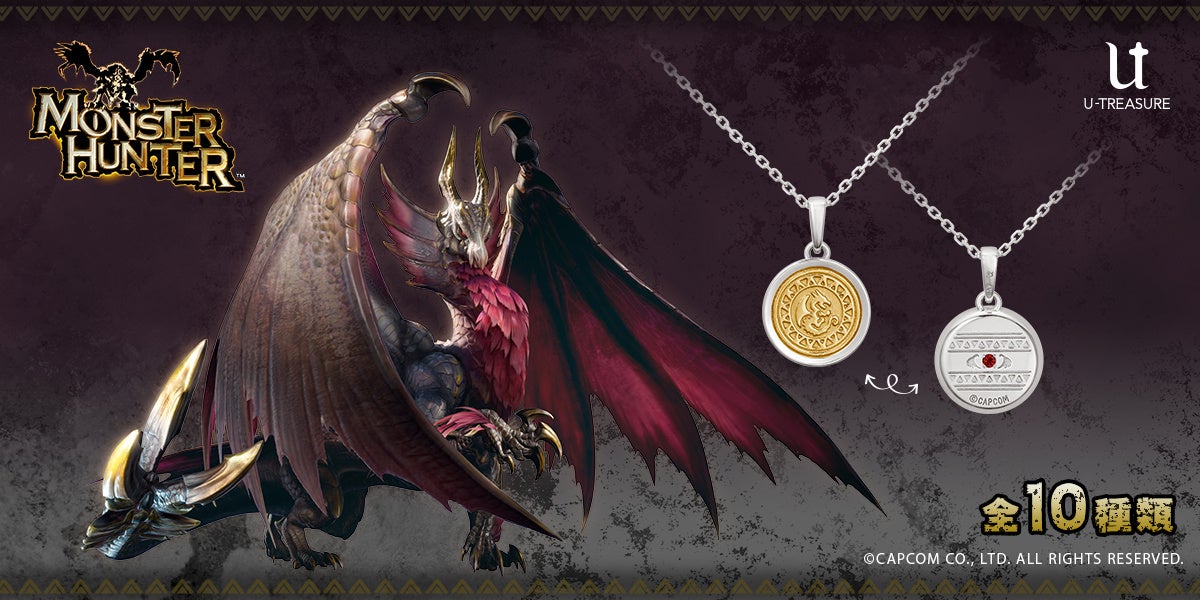 このたびの新作は、表面にイエローゴールドコーティングを施し、シルバーとゴールドのコントラストが上品な印象のネックレスです。リオレウス、リオレイアはもちろん、マガイマガドや、最新作『モンスターハンターライズ:サンブレイク』のメインモンスターであるメル・ゼナなど、全10種類をご用意。それぞれのモンスターをイメージした刻印と宝石が裏面にデザインされています。ユートレジャーコンセプトストア池袋、ユートレジャーオンラインショップにてご購入いただけます。