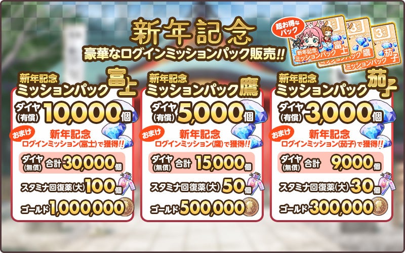 購入すると有償ダイヤとスタミナ回復薬(大)やゴールドが獲得できるほか、大量の無償ダイヤを獲得できる3日間のログインミッションが付与されます!