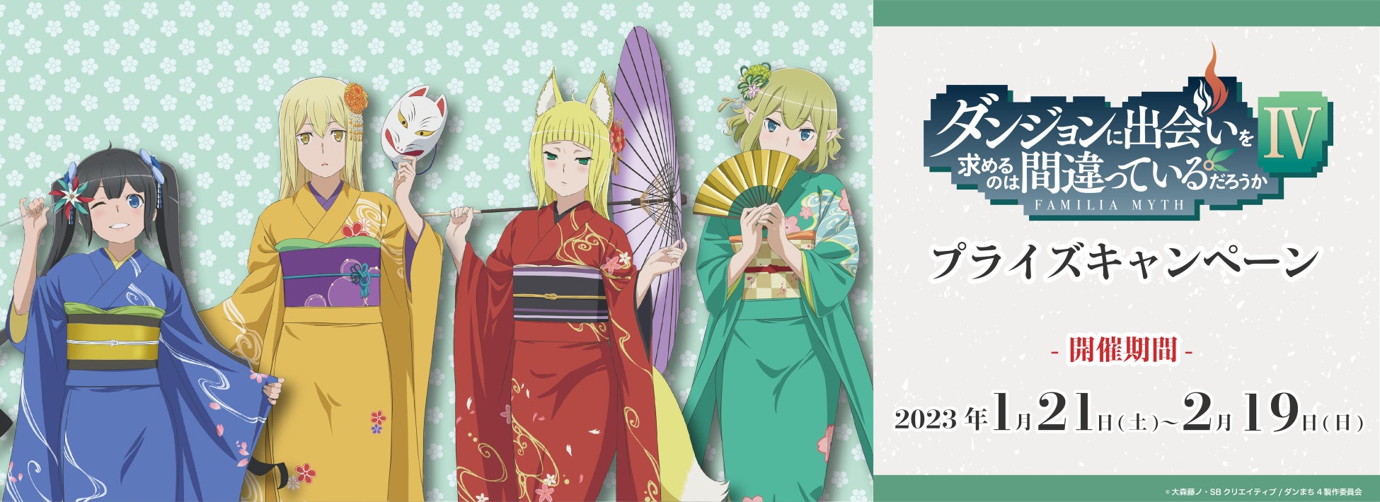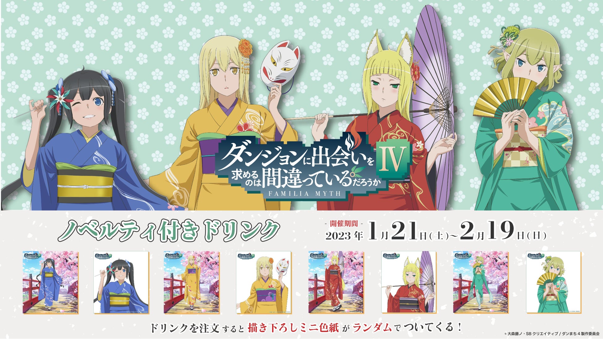 株式会社GENDA GiGO Entertainment(本社:東京都港区 代表取締役社長:上野 聖 以下当社)は2023年1月21日(土)より、GiGOグループが運営する対象店舗にて、アニメ『ダンジョンに出会いを求めるのは間違っているだろうかIV』の限定描き下ろしを使用したコラボ企画を開催いたします。