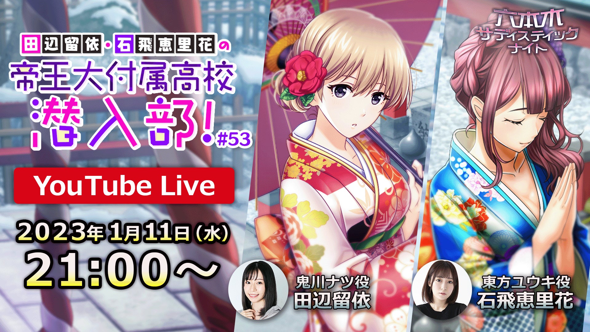 株式会社ボルテージ(本社:東京都渋谷区 代表取締役:津谷 祐司)は、現在配信中のカード型サスペンスアプリ「六本木サディスティックナイト」の公式YouTube番組「田辺留依・石飛恵里花の帝王大付属高校潜入部!#53」を1月11日(水)21:00より生配信することをお知らせいたします。