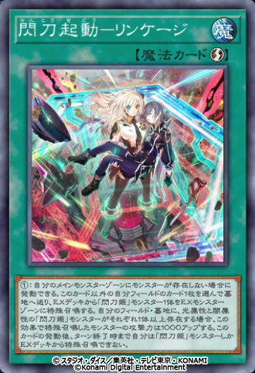①:自分のメインモンスターゾーンにモンスターが存在しない場合に発動できる。このカード以外の自分フィールドのカード1枚を選んで墓地へ送り、EXデッキから「閃刀姫」モンスター1体をEXモンスターゾーンに特殊召喚する。自分のフィールド・墓地に、光属性と闇属性の「閃刀姫」モンスターがそれぞれ1体以上存在する場合、この効果で特殊召喚したモンスターの攻撃力は1000アップする。このカードの発動後、ターン終了時まで自分は「閃刀姫」モンスターしかEXデッキから特殊召喚できない。