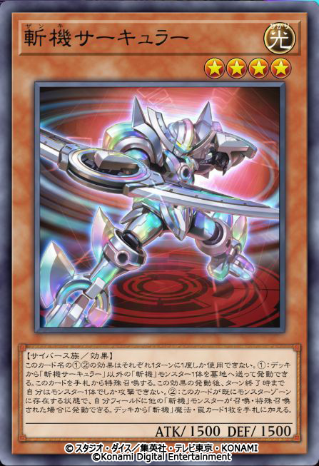 このカード名の①②の効果はそれぞれ1ターンに1度しか使用できない。①:デッキから「斬機サーキュラー」以外の「斬機」モンスター1体を墓地へ送って発動できる。このカードを手札から特殊召喚する。この効果の発動後、ターン終了時まで自分はモンスター1体でしか攻撃できない。②:このカードが既にモンスターゾーンに存在する状態で、自分フィールドに他の「斬機」モンスターが召喚・特殊召喚された場合に発動できる。デッキから「斬機」魔法・罠カード1枚を手札に加える。