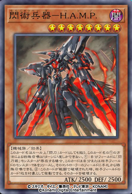 このカード名はルール上「閃刀」カードとしても扱う。このカード名の①の方法による特殊召喚は1ターンに1度しかできない。①:自分フィールドに「閃刀姫」モンスターが存在する場合、このカードは自分または相手フィールドのモンスター1体をリリースし、そのコントローラーのフィールドに手札から特殊召喚できる。②:このカードが戦闘で破壊された時、相手フィールドのカード1枚を対象として発動できる。そのカードを破壊する。