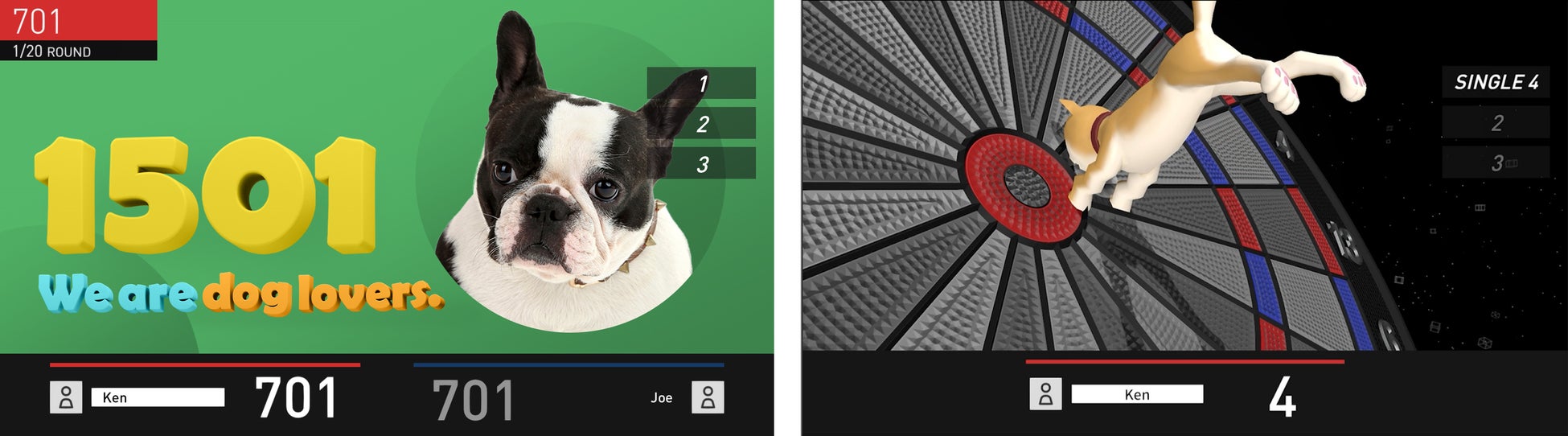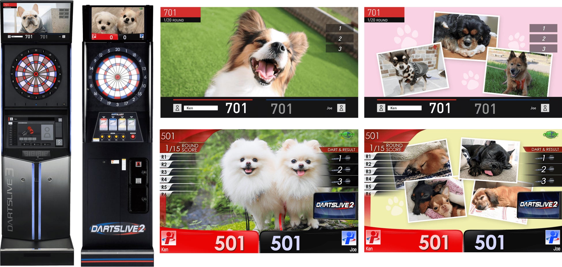 ダーツの定番ゲーム「カウントアップ」は、0点からスタートして得点を加算していくゲームです。1ラウンドにつき投げるダーツは3本、全8ラウンド。今回登場の「ワンちゃんカウントアップ」では、ダーツを投げるごとに表示されるゲーム画面が採用された愛犬家のペット写真となっています。