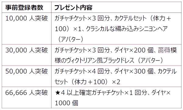 『イケメンヴィラン 闇夜にひらく悪の恋』の公式サイト、公式LINE、公式Twitter、イケメンシリーズファンクラブのいずれかにおいて事前登録いただいたお客様に向けたキャンペーンを開催します。事前登録数に応じて最大10回分のガチャチケットやダイヤ1500個など豪華アイテムがもらえるキャンペーンとなります。
