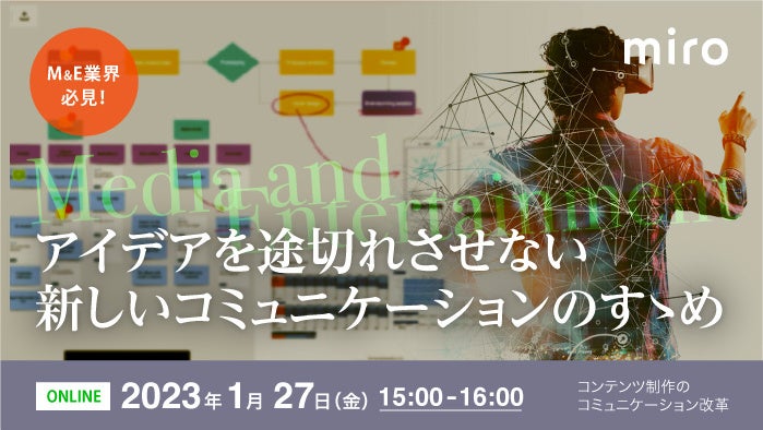 このウェビナーでは、クリエイティブワークに必要なブレスト・アイデア出しの視覚化はもちろん、各チームの業務に応じた課題解決など生産性の高い業務の遂行に役立つ、コラボレーションツール「Miro」の各種機能や、M&E業界に特化したユースケース、導入事例をご紹介します。
