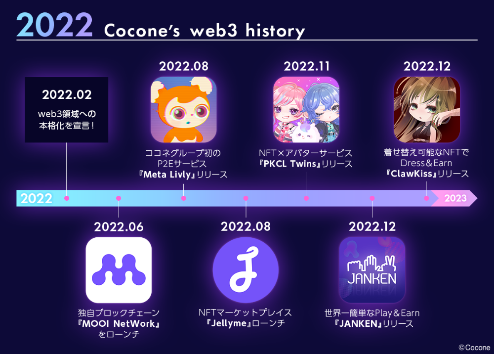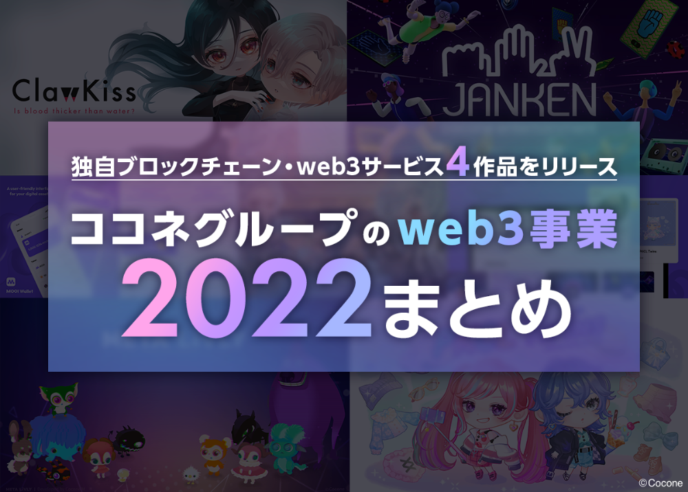 2018年頃からブロックチェーン技術の研究を始めたココネグループは、2022年にweb3事業を本格化しました。独自のブロックチェーン「MOOI Network」の運用開始を皮切りに、2022年中に同チェーンを基盤にしたGameFiを含む4本のweb3サービスを立て続けにリリースしています。