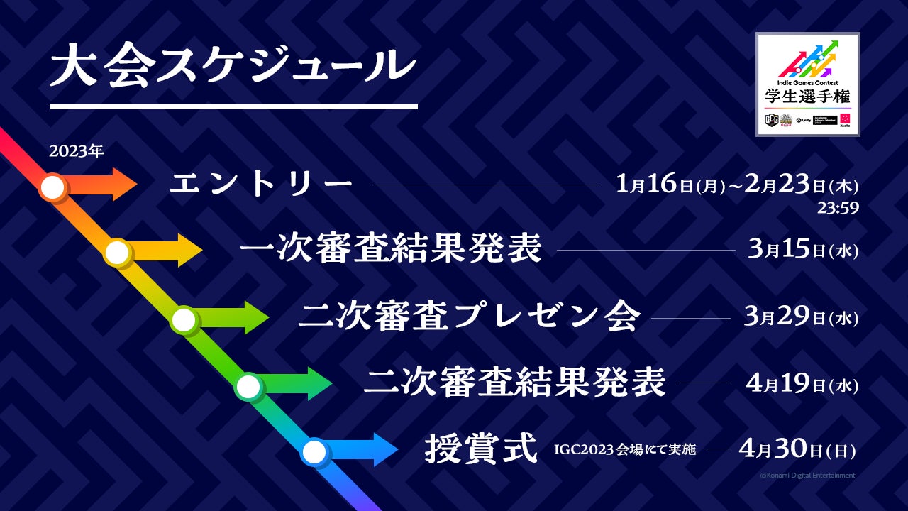 国内在住の大学生、大学院生、専門学生を対象とした学生向けインディーゲームコンテンストです。優秀な作品を通じて業界に羽ばたきたいと願う学生にスポットを当て、ジャンルや応募作品数を問わず、幅広く募集を行います。一次審査で選出された20作品は「ゲームクリエイター甲子園」のショーケースとなる「みんなのゲームパレード」にて紹介され、さらに二次審査を通過した5作品は4月30日(日)に開催される「Indie Games Connect 2023」の授賞式にて発表となります。