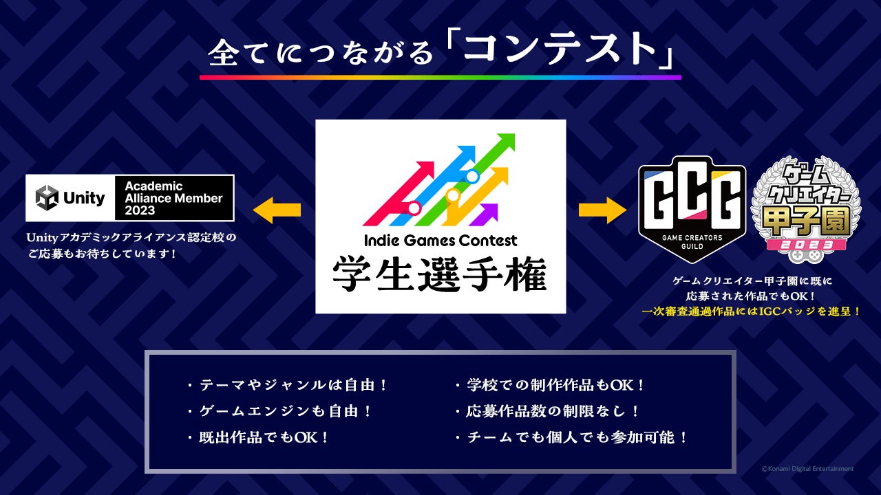 株式会社STAND(本社:東京都豊島区、代表:宮田 大介、以下「STAND」)内、学生インディーゲームの成長型コンテスト「ゲームクリエイター甲子園」を運営するゲームクリエイターズギルドは、株式会社コナミデジタルエンタテインメント(本社:東京都中央区、代表:早川 英樹、以下「コナミデジタルエンタテインメント」)が開催する、学生向けインディーゲームコンテスト「Indie Games Contest 学生選手権」に運営協力します。また、本コンテストの一次審査通過作品の20作品は「ゲームクリエイター甲子園 2023」でもシード枠としてエントリーさせていただき、作品ショーケースの「みんなのゲームパレード」でも特別バッジを付与の上で掲載させていただきます。