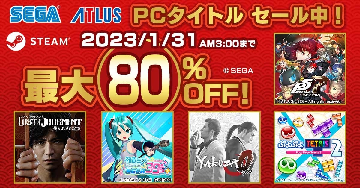 今回のセールでは、『LOST JUDGMENT:裁かれざる記憶』、『初音ミク Project DIVA MEGA39’s+ VIP Edition』、『ペルソナ5 ザ・ロイヤル』などの人気タイトルを特別価格で販売しております。