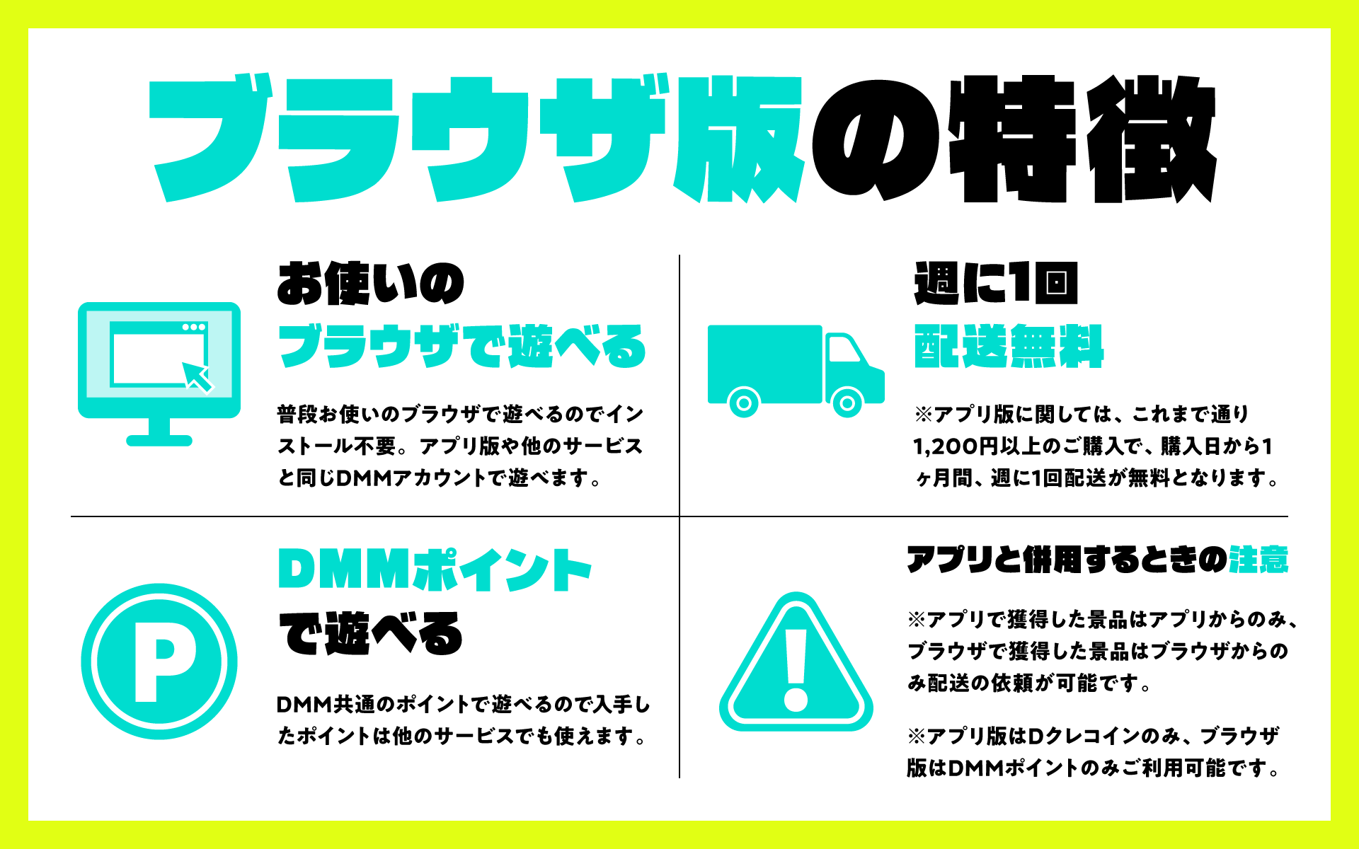 1月25日(水)より、DMMオンクレはブラウザ版の提供を開始いたします。ブラウザ版の特徴として、DMMの各サービス共通のDMMポイントで遊ぶことができるほか、購入金額に関係なく、週に1回配送が無料になります。なお、基本操作はアプリ版とほとんど変わらないため、アプリ版を利用されていた方もこれまでと同じ操作感でブラウザ版をご利用いただけます。