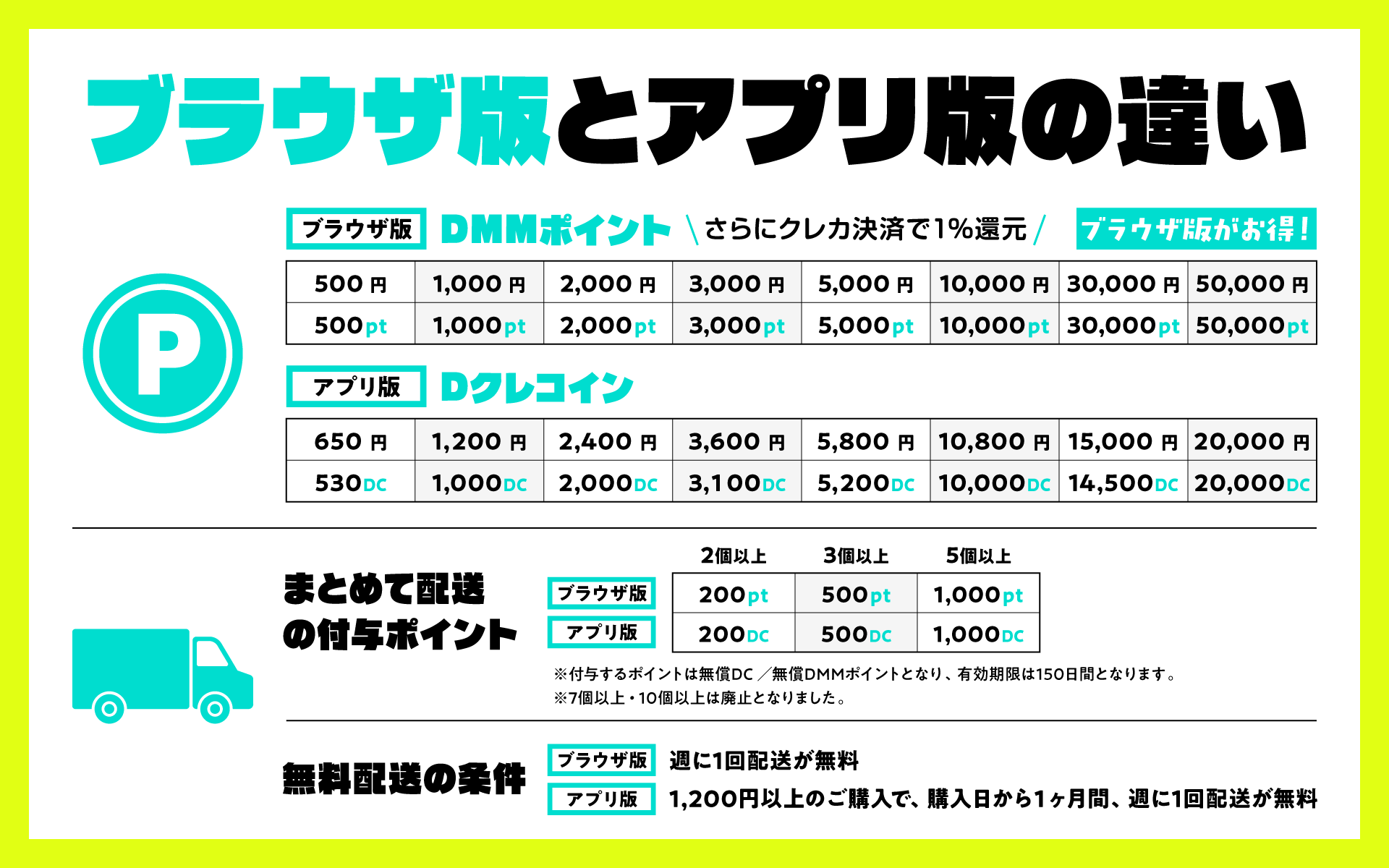 ブラウザ版では、週に1回配送が無料になります。アプリ版では、1,200円以上DC購入された方が対象の配送無料特典が、ブラウザ版ではDMMポイントの購入有無にかかわらずどなたでも対象になりました。