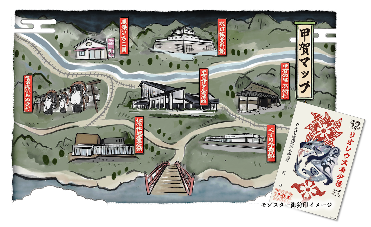 甲賀市内の各スポットで依頼されるクエストを達成すると「モンスター御狩印」がもらえます。「甲賀リアル忍者館」で「モンスター御狩印帖」を購入して、集めた「モンスター御狩印」を巻物にコレクションすることも!クエストを達成してここでしかもらえない「モンスター御狩印」を手に入れよう。
