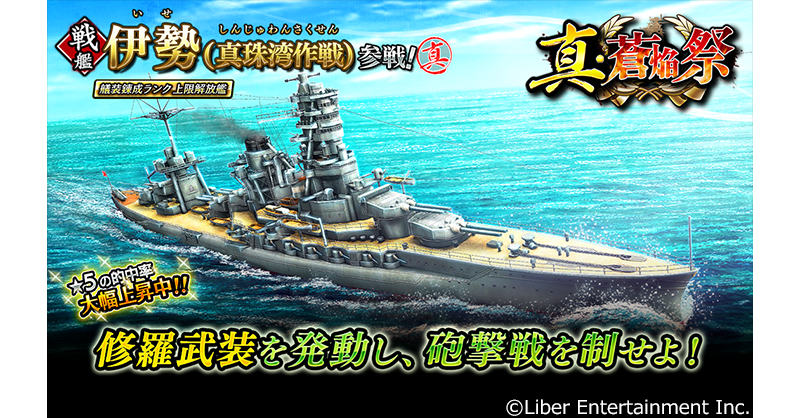 株式会社リベル・エンタテインメントは、男性向けオリジナルタイトル『蒼焔の艦隊』(そうえんのかんたい、iOS/Android/DMM Games)について、本日1月25日(水)より、新たに伊勢(真珠湾作戦)が参戦する真・蒼焔祭が開催されたことをお知らせいたします。