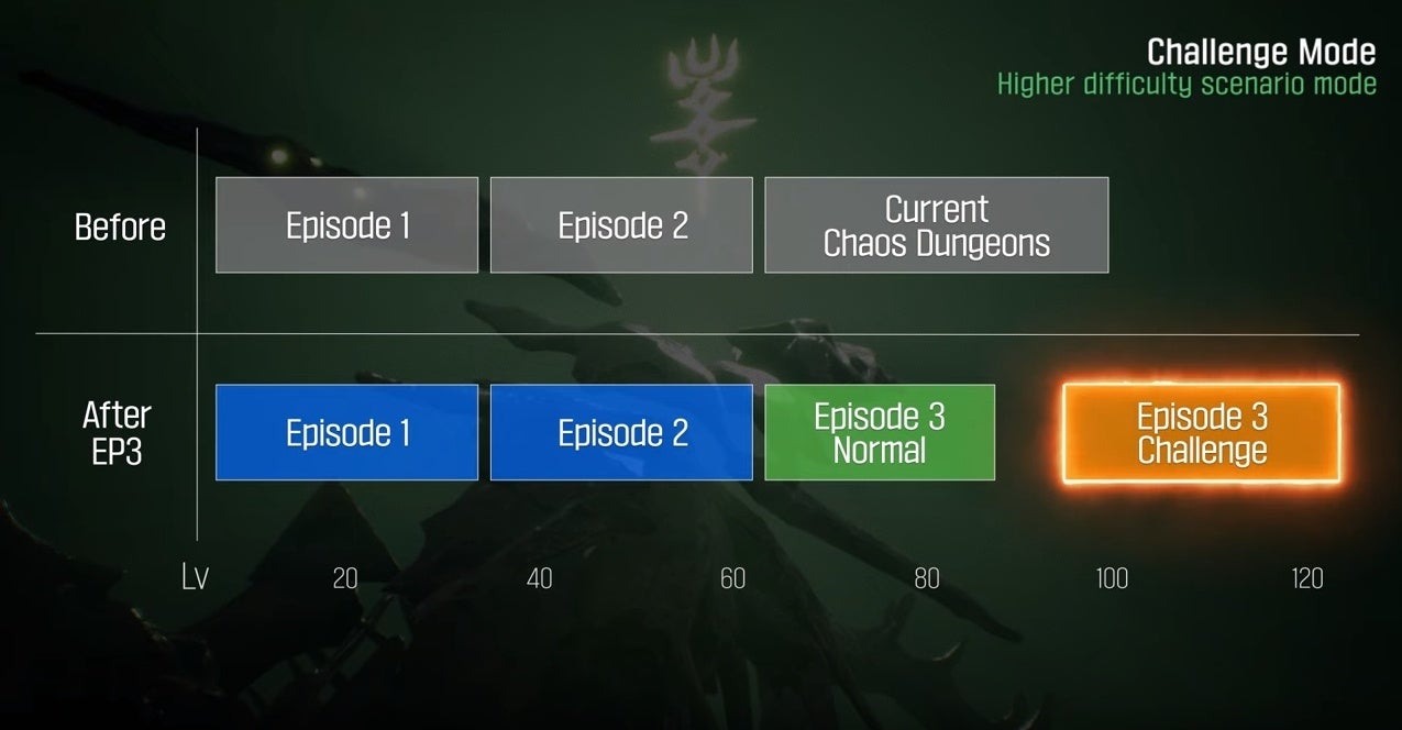 : より難しいゲームを楽しむことができる「チャレンジモード」が追加されました。エピソード2の最後のクエストをクリアした後「カオスダンジョン」で一定部分のキャラクターを成長させた後プレイ可能な程の体感難易度でプレイすることができます。