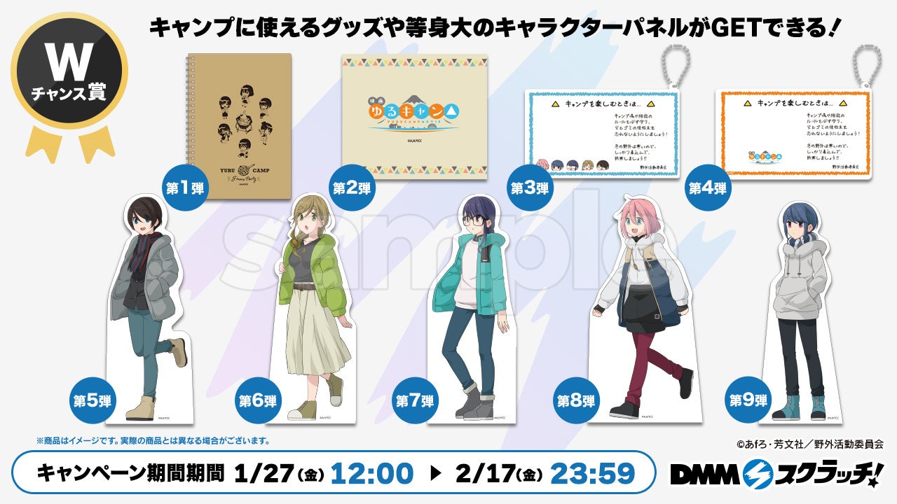 合同会社DMM.com(本社:東京都港区、会長 兼 CEO亀山敬司、https://dmm-corp.com/ 以下DMM )は、ハズレなしのオンラインくじサービス「DMMスクラッチ」にて、2023年1月27日(金)より映画 『ゆるキャン△』 スモアパーティー スクラッチを販売することをお知らせいたします。本くじでは、デフォルメイラストを使用した多彩なラインナップと共に、等身大パネルなど限定商品が抽選で当たるWチャンス賞を計22日間開催いたします。