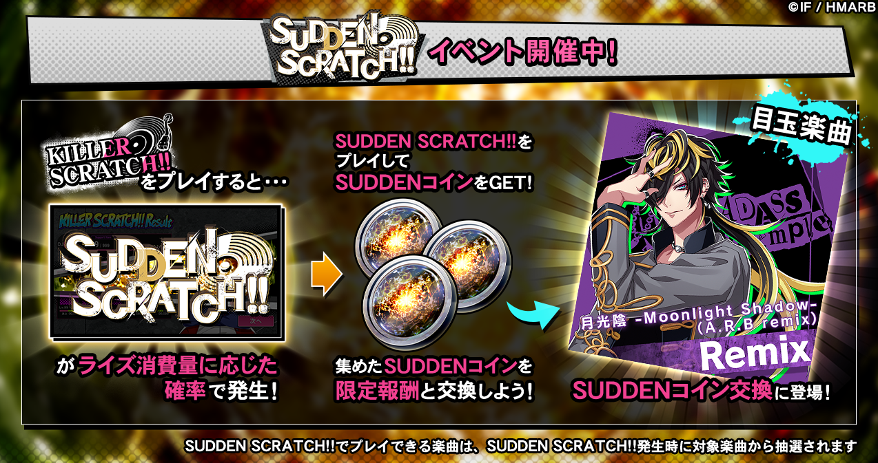 イベント期間中、KILLER SCRATCH!!をプレイするとライズ消費量に応じた確率でSUDDEN SCRATCH!!が発生します。SUDDEN SCRATCH!!をプレイすると、通常の報酬アイテムの他、限定アイテム「SUDDENコイン」を獲得することができます。「SUDDENコイン」を集めることで、新楽曲「月光陰 -Moonlight Shadow-(A.R.B remix)」と交換することが可能です。詳細はアプリ内お知らせをご確認ください。