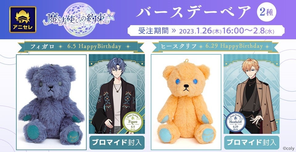 『animate LIMITED SELECTION(アニセレ)』とは、アニメ・コミック・ゲームの専門店「アニメイト」が様々なグッズメーカーと共同で商品を企画、アニメイトでしか手に入らない高品質な受注生産商品をお客様へお届けするプロジェクトです。2023年5月12日頃に発売を予定している『魔法使いの約束』の「バースデーベア」は、作中のキャラクターたちの誕生日をお祝いした商品。6月に誕生日を迎える「フィガロ」「ヒースクリフ」をイメージしたベアで、オリジナルのボックスにブロマイドも封入しております。全国アニメイト・アニメイト通販にて、2023年2月8日まで受注受付を行っております。