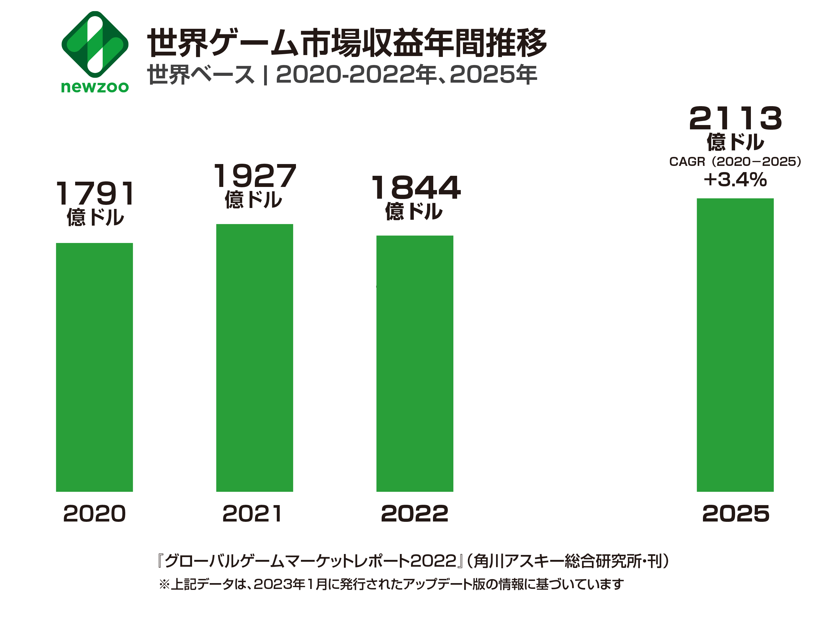 しかし世界のゲームプレイヤー数は、前年比4.6%増の約32億人でエンゲージメントはまったく低下しておらず、2023年以降は再び成長軌道に戻ると推測。2025年には2113億ドルまで市場規模が拡大すると推測します。