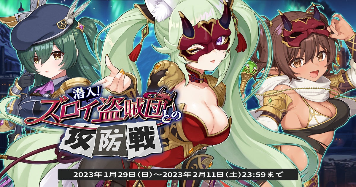 開催中のイベント「潜入!ズロイ盗賊団との攻防戦」で編成すると、アイテムドロップ率とキャラクターの獲得経験値がUPします!