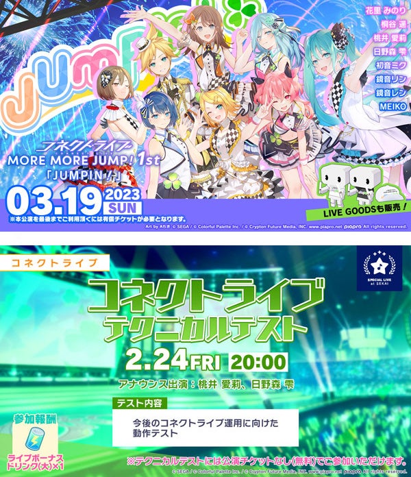 2月24日(金)20時から開催予定で、MORE MORE JUMP!から桃井愛莉、日野森雫がアナウンス出演いたします。本公演はコネクトライブ運用に向けての動作テストとなりますので、参加には公演チケットなしでご参加いただけます。