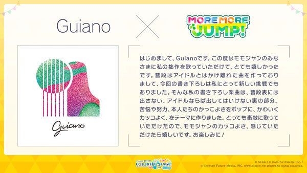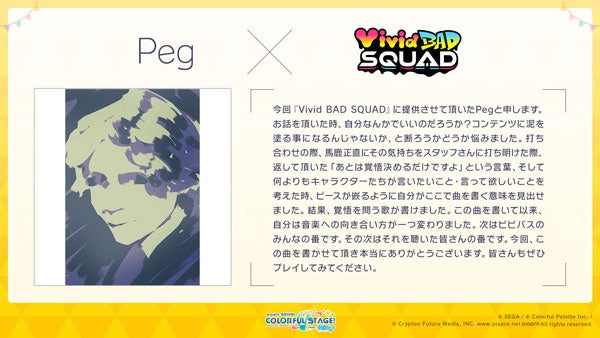 Guianoさんには「MORE MORE JUMP!」のユニット楽曲、Pegさんには「Vivid BAD SQUAD」のユニット楽曲を提供いただきます。