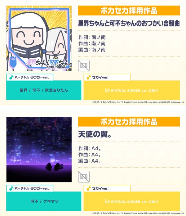 「ボカコレ2022 秋」と『プロジェクトセカイ』のコラボ企画「ボカセカ」の採用作品、「星界ちゃんと可不ちゃんのおつかい合騒曲」(作詞・作曲:南ノ南)と、「天使の翼。」(作詞・作曲:A4。)をリズムゲーム楽曲に追加することが決定いたしました。