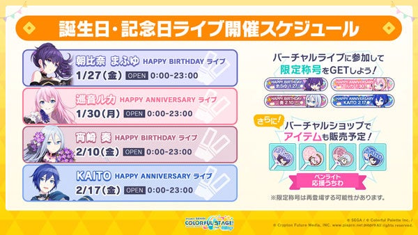 巡音ルカ、宵崎奏、KAITOの記念日・誕生日を記念して、バーチャルライブの開催が決定いたしました。バーチャルショップにてアイテムペンライト「応援うちわ」を販売予定です。今回も誕生日にあわせて「HAPPY ANNIVERSARY ガチャ」「HAPPY BIRTHDAY ガチャ」を開催いたします。