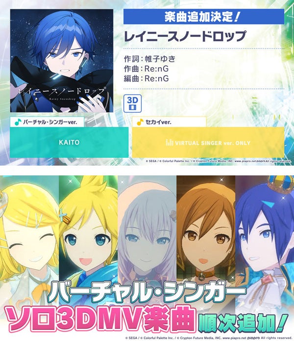 新たなリズムゲーム楽曲として、KAITOが歌唱する「レイニースノードロップ」(作詞:帷子ゆき・作曲:Re:nG)の追加が決定いたしました。